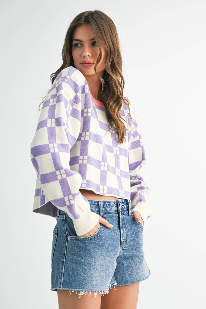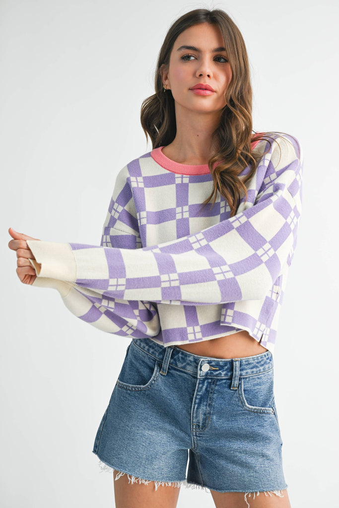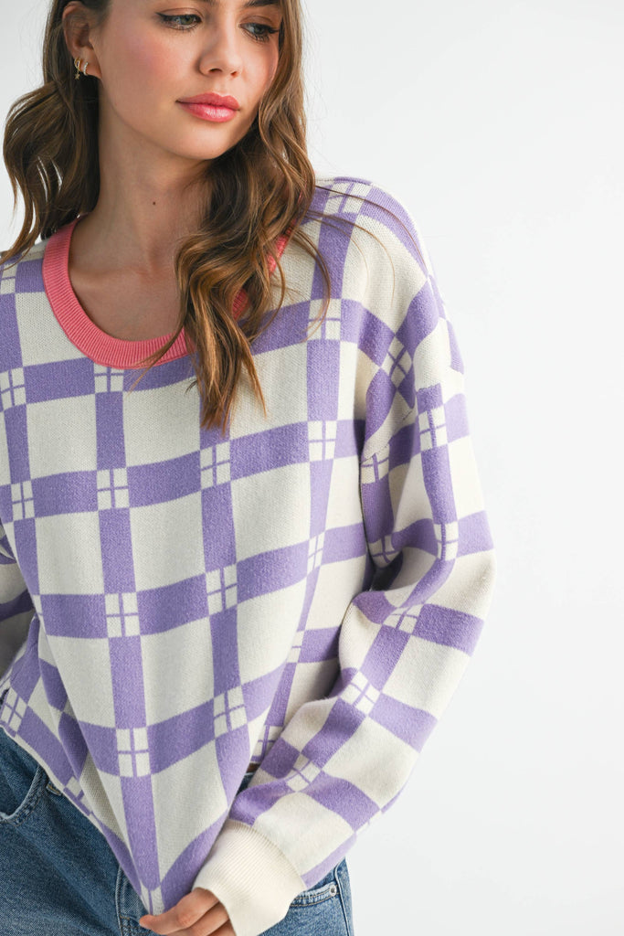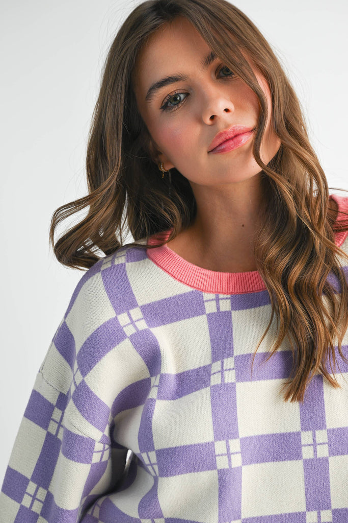 Pam Plaid Sweater features a plaid pattern, a contrasting neck, and a boxy fit for a comfortable yet stylish look. Ideal for cozy, casual days.