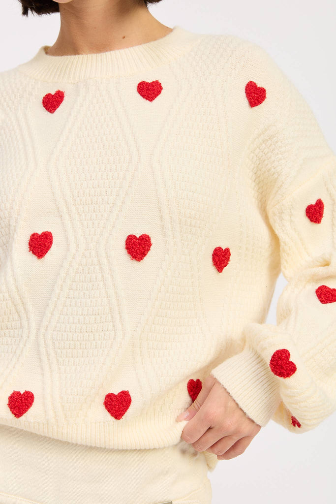Snuggle into sweetness with this ivory knitted sweater featuring charming red heart embroidery that'll make you smile every time you wear it. The soft, relaxed fit and long sleeves deliver maximum coziness for lazy days and casual hangouts. Perfect for layering or wearing solo, this playful piece brings a dash of romance and comfort to your everyday wardrobe without taking itself too seriously.