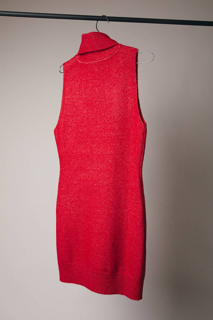 Wrap yourself in cozy holiday vibes with this sleek sleeveless turtleneck knit dress in rich red. Crafted from eco-conscious recycled yarn, it's the perfect blend of style and sustainability. The timeless turtleneck silhouette pairs effortlessly with your favourite layers, while the fitted knit hugs you in all the right ways.