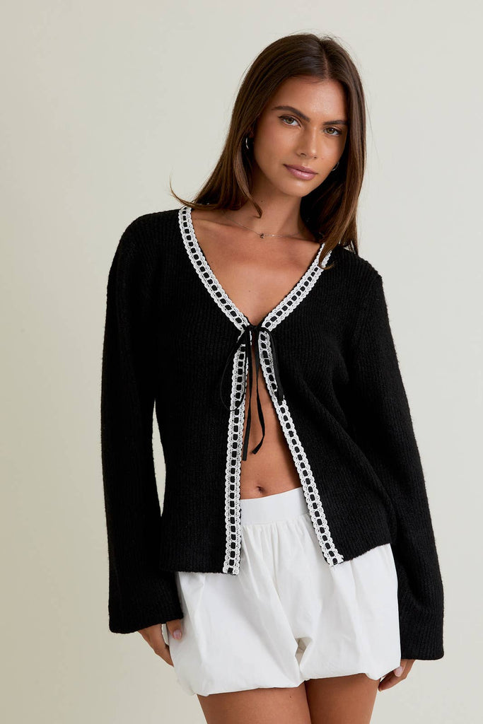 This refined black cardigan exemplifies understated elegance with its carefully crafted trim detailing and graceful tie-front design.