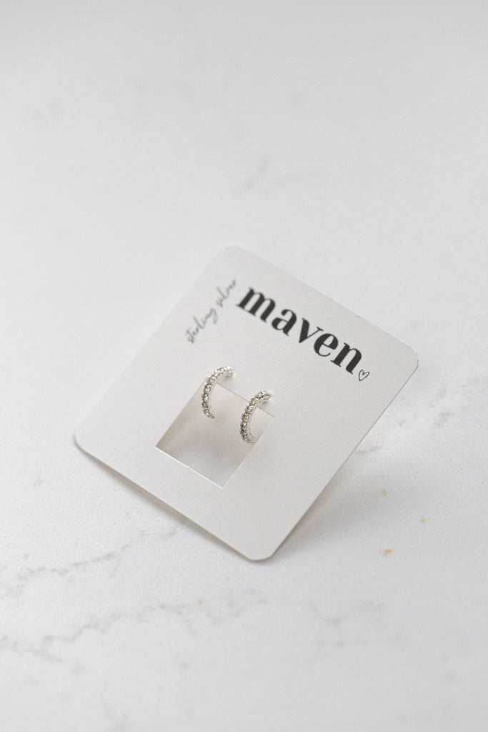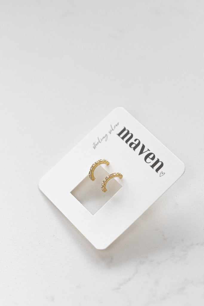 Multi-facetted cubic zirconia stones line these sweet half-hoop, huggie style stud earrings