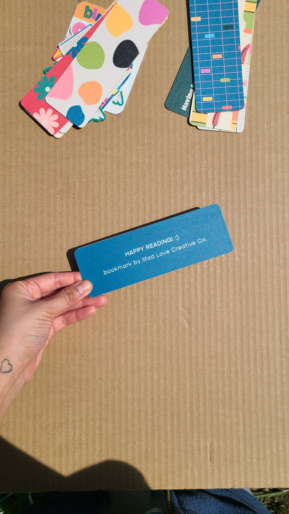 - Backside of bookmark is a solid, prominent colour featured on the front of the design and reads "Happy Reading! :)