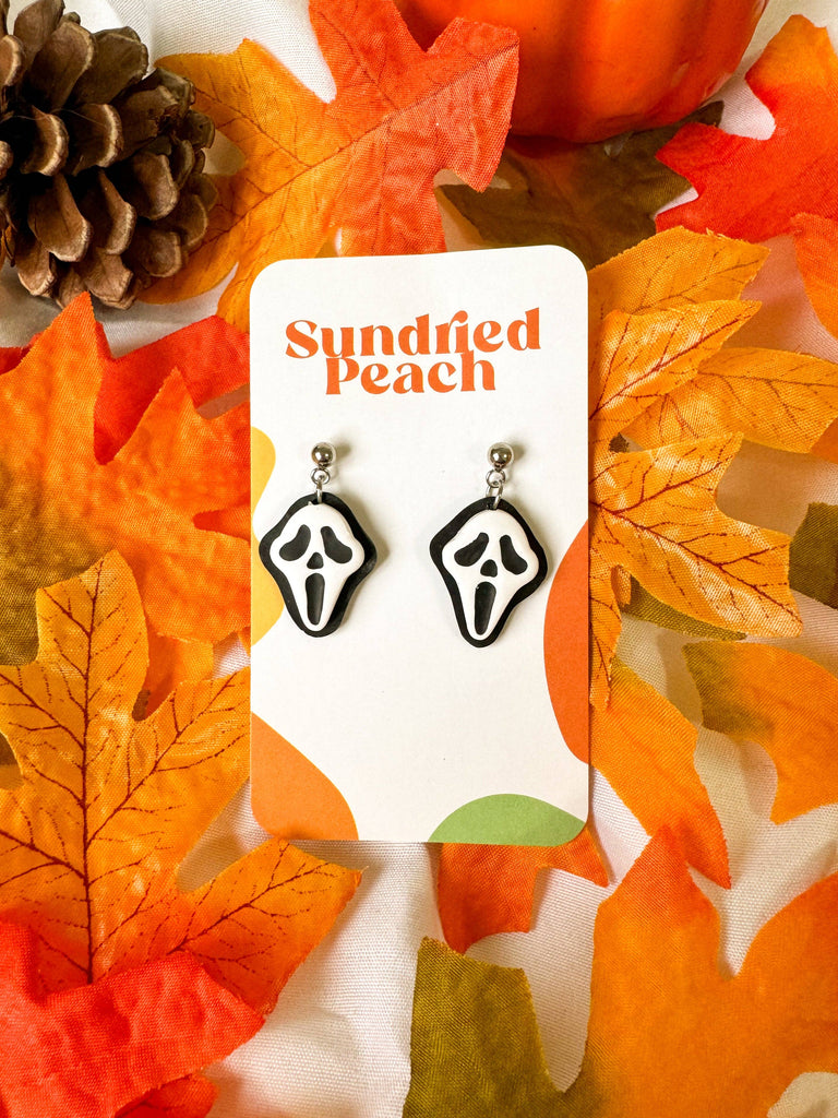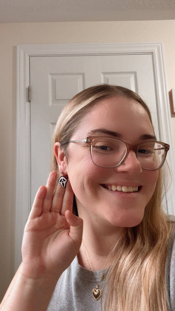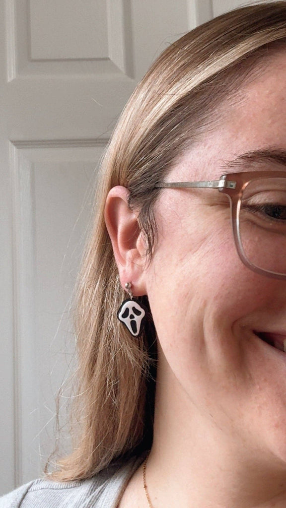 Get ready to scream (not for real - we don't want to scare anyone!) with our handmade Ghost Mask earrings. These unique earrings feature the iconic ghost face from the classic slasher film, crafted from polymer clay for a lightweight and comfortable wear. Perfect for adding a touch of spooky to any outfit.